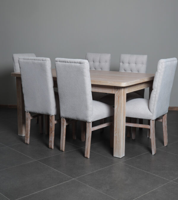 Está fabricado en madera nativa del sur de Chile o en mara clara, una madera brasileña noble y resistente. En la web encontrarás versiones listas para entrega, pero si querés llevarlo a tu estilo, podés personalizar el color del barniz (albayalde, natural o nogal), el tapiz (lino, chenilla o velvet), la técnica de tapizado y el tamaño (de 4 a 8 personas).